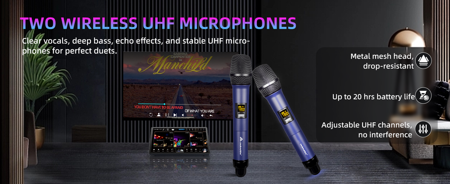 Sing in Any Language You Love – 16+ language supports, perfect for multicultural families, or parties with international friends. Two UHF wireless microphones with studio-grade pickup, ensuring clear vocals, strong connectivity, and zero interference for duets and group singing